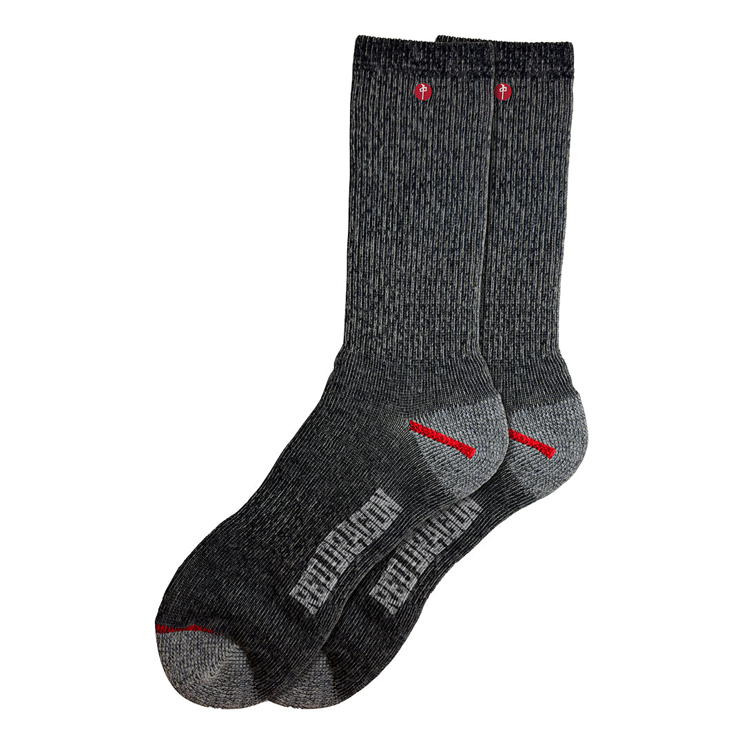 Thermal Socks constructed with a 56% Merino Wool, 43% Nylon and 1% Spandex blend that combines the comfort, moisture wicking, and odor-resistant properties of Merino Wool with the durability, washability and performance of synthetics. Small RDS Logo embroidery and jacquar knit Red Dragon script with contrast toe stitching.